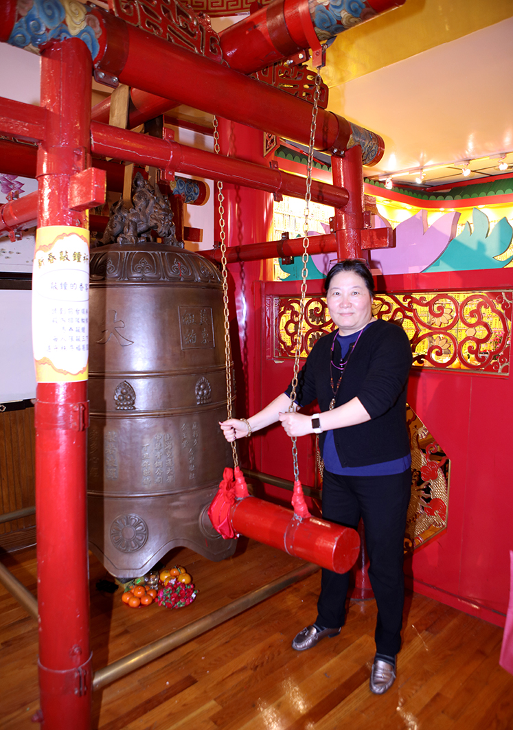 在中國農曆新年期間敲響寺廟鐘聲,為城市中的每個人帶來好運/和平